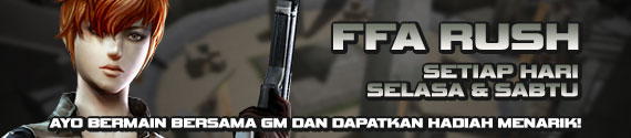 Kali ini GameMaster ingin mengadu kemampuan Prajurit CF didalam pertempuran. Event dengan tema FFA RUSH akan menggunakan mode FFA ( Free for All ) dan Map yang akan digunakan adalah Random.